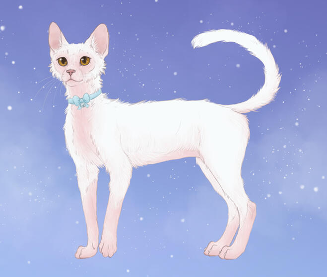 Breed: LykoiHeight: 9" at shouldersWeight: 7lbsEye Color: Dark orange-goldFur: Pure white and soft despite it's coarse appearance; patches on face, throat, legs, and belly where healthy pink skin is exposed.Build: Lanky and thin